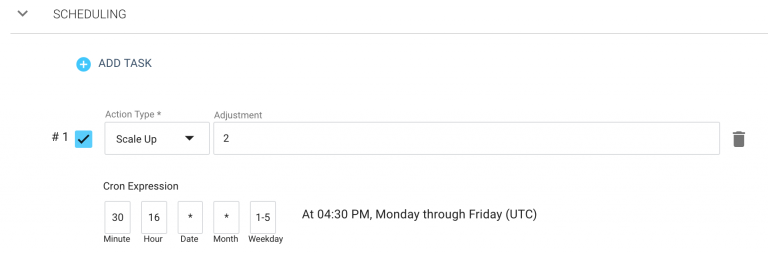 The cron expression 30 16 * * 1-5 defines a recurring Scale Up task that repeats at 16:30 UTC, Monday through Friday.